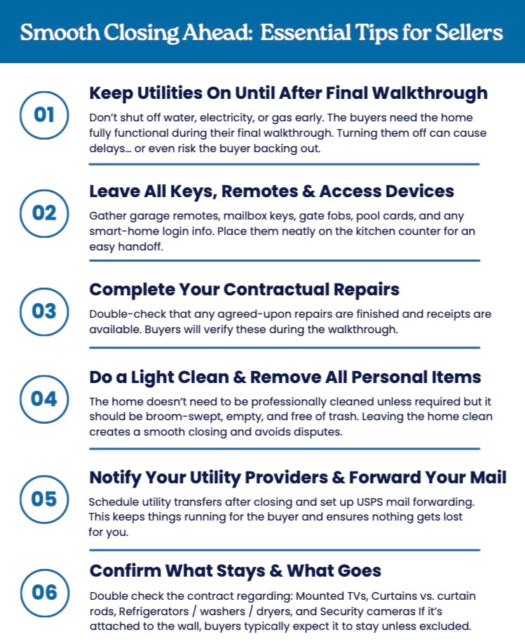 It sounds small, but it can create unnecessary stress right before closing. During the final walk-through, buyers may need to check that the lights work, run the water, test appliances, and confirm the home is in the agreed-upon condition.